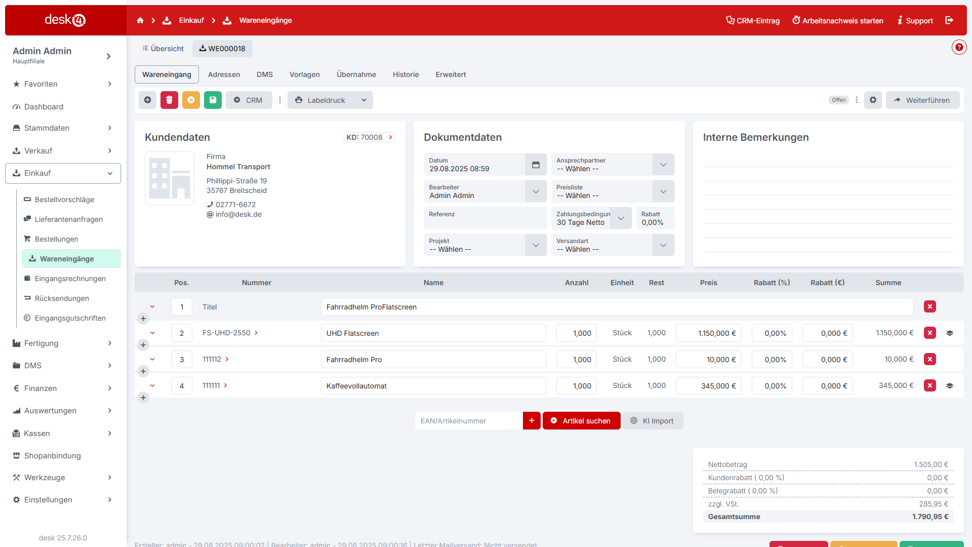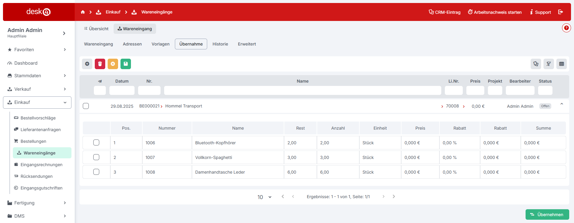 {% hint style="warning" %} <mark style="color:red;">Ob die Mitarbeiter einer bestimmten Gruppe im Wareneingang Preise oder den Lagerplatz angezeigt bekommen, bestimmen Sie über die</mark> [<mark style="color:red;">**Rechte der Gruppe**</mark>](https://docs.desk4.de/einstellungen/mitarbeiter/berechtigungen#preise-in-lieferscheinen-und-wareneingaengen-anzeigen)<mark style="color:red;">.</mark>&#x20;