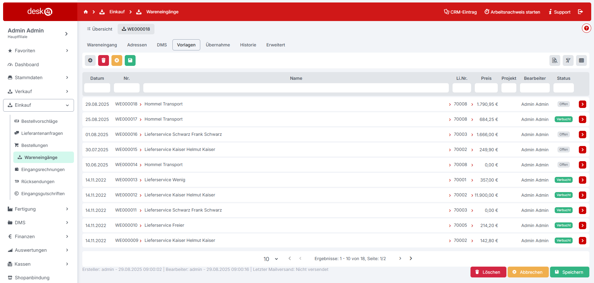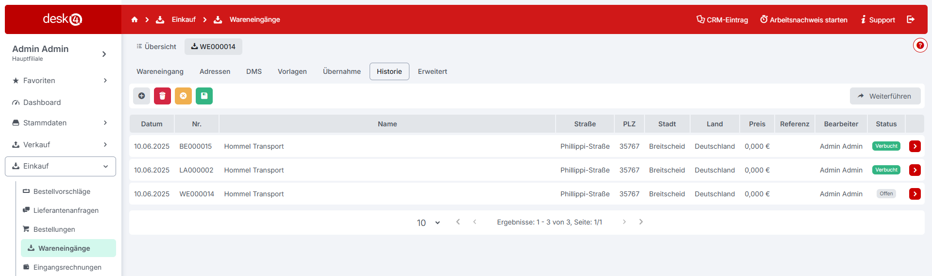 Sie haben die Möglichkeit ihn einzusehen, zu bearbeiten oder einen neuen Wareneingang anzulegen.