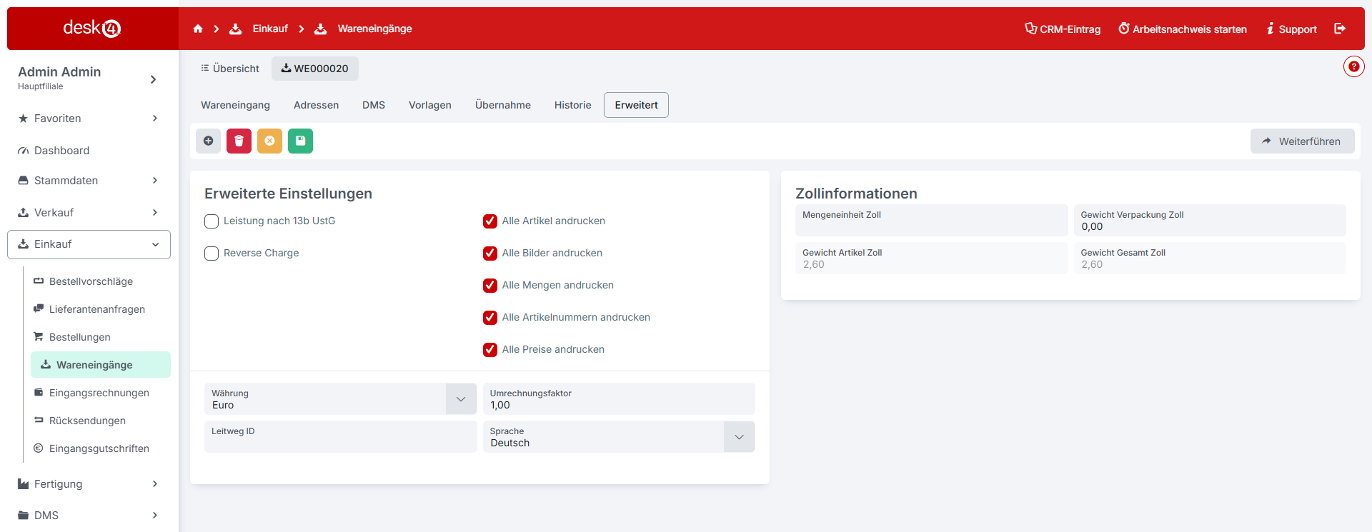 Nach Öffnen eines Wareneingangs, haben Sie die Möglichkeit, verschiedene Daten einzusehen und zu bearbeiten.