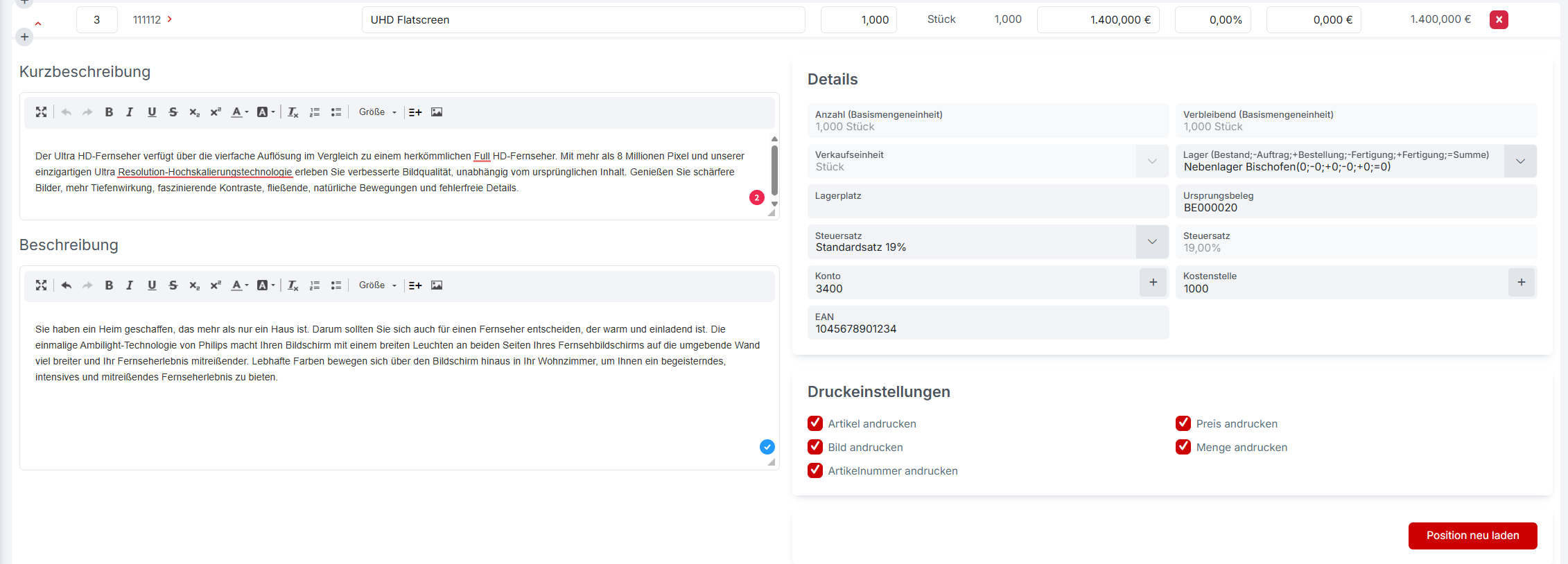 In dieser Ansicht ist es zum Beispiel möglich, die **Beschreibung** der Artikel zu ändern.\