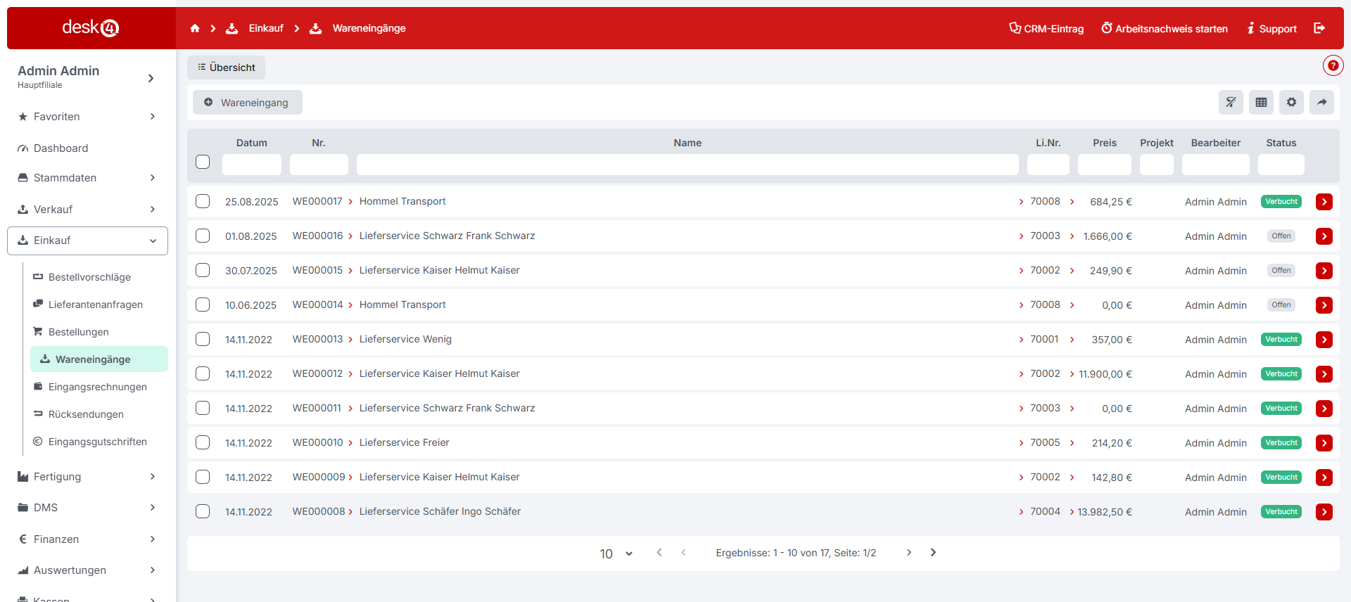 Der Menüpunkt **„Wareneingänge“** ist unter dem Hauptpunkt **„Einkauf“** im linken Seitenmenü zu finden.\