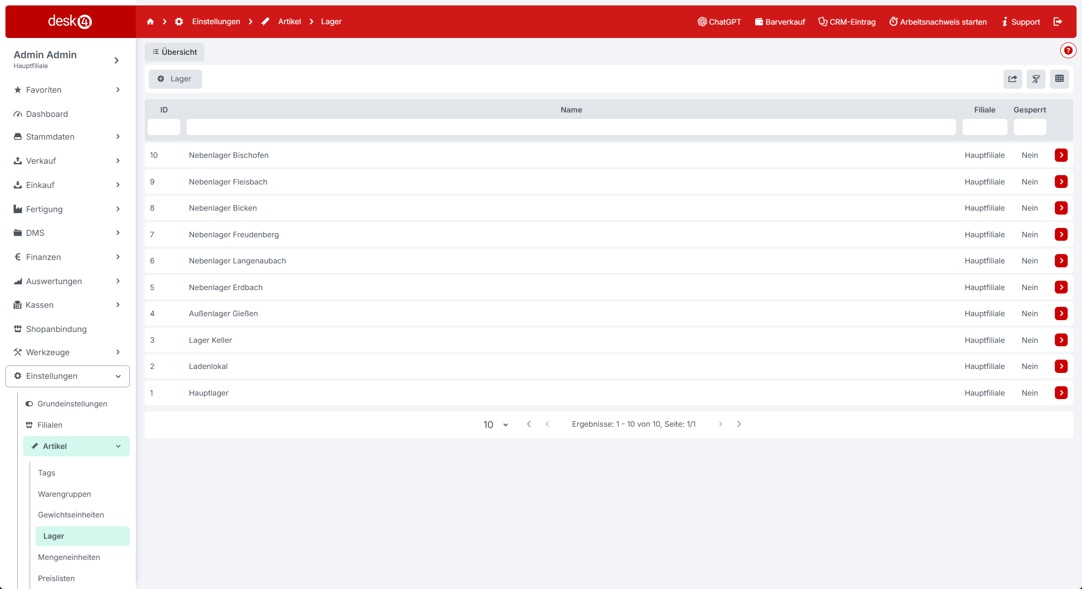 {% hint style="warning" %} <mark style="color:red;">Wenn Sie weitere Filialen anlegen möchten, erfahren Sie</mark> [***hier***](https://docs.desk4.de/einstellungen/filialen) *<mark style="color:red;">mehr darüber</mark>*.