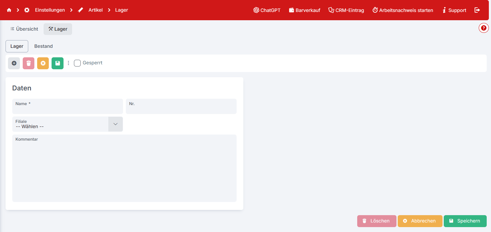 Auch haben Sie die Möglichkeit ein Lager zu sperren, indem Sie ![](https://901075246-files.gitbook.io/~/files/v0/b/gitbook-x-prod.appspot.com/o/spaces%2FBlYqQ7S4FQO2M6oDBNFF%2Fuploads%2FtKxAWSrgfdu9N0O2jCod%2FGesperrt.PNG?alt=media\&token=7a189cde-161a-4197-98e5-1ab283879f23) mit einem Haken belegen. Ein gesperrtes Lager steht in Belegen nicht mehr zur Auswahl zur Verfügung.