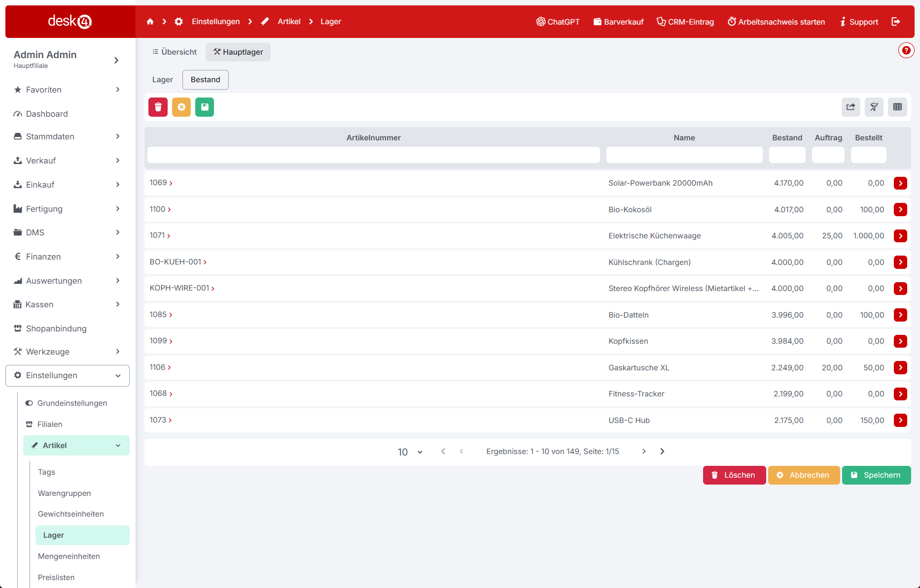 Über den Reiter **"Bestand"** haben Sie die Möglichkeit die Bestände der einzelnen Artikel,\