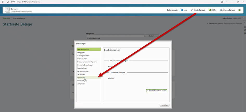<figure><img src="https://901075246-files.gitbook.io/~/files/v0/b/gitbook-x-prod.appspot.com/o/spaces%2FBlYqQ7S4FQO2M6oDBNFF%2Fuploads%2Fl1htmWTIAcbuVLbMWrUm%2Fgrafik.png?alt=media&#x26;token=2a3fa2ce-132d-4fd5-a293-ec08432268fe" alt=""><figcaption><p>Upload Mail Einstellungen in <strong>DATEV Unternehmen online</strong></p></figcaption></figure>