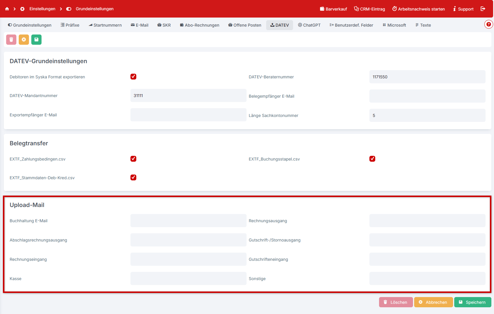* **Exportempfänger E-Mail**: An diese E-Mail-Adresse wird der Datev-Export gesendet, wenn man im Datev-Export auf den Button "Senden" klickt
