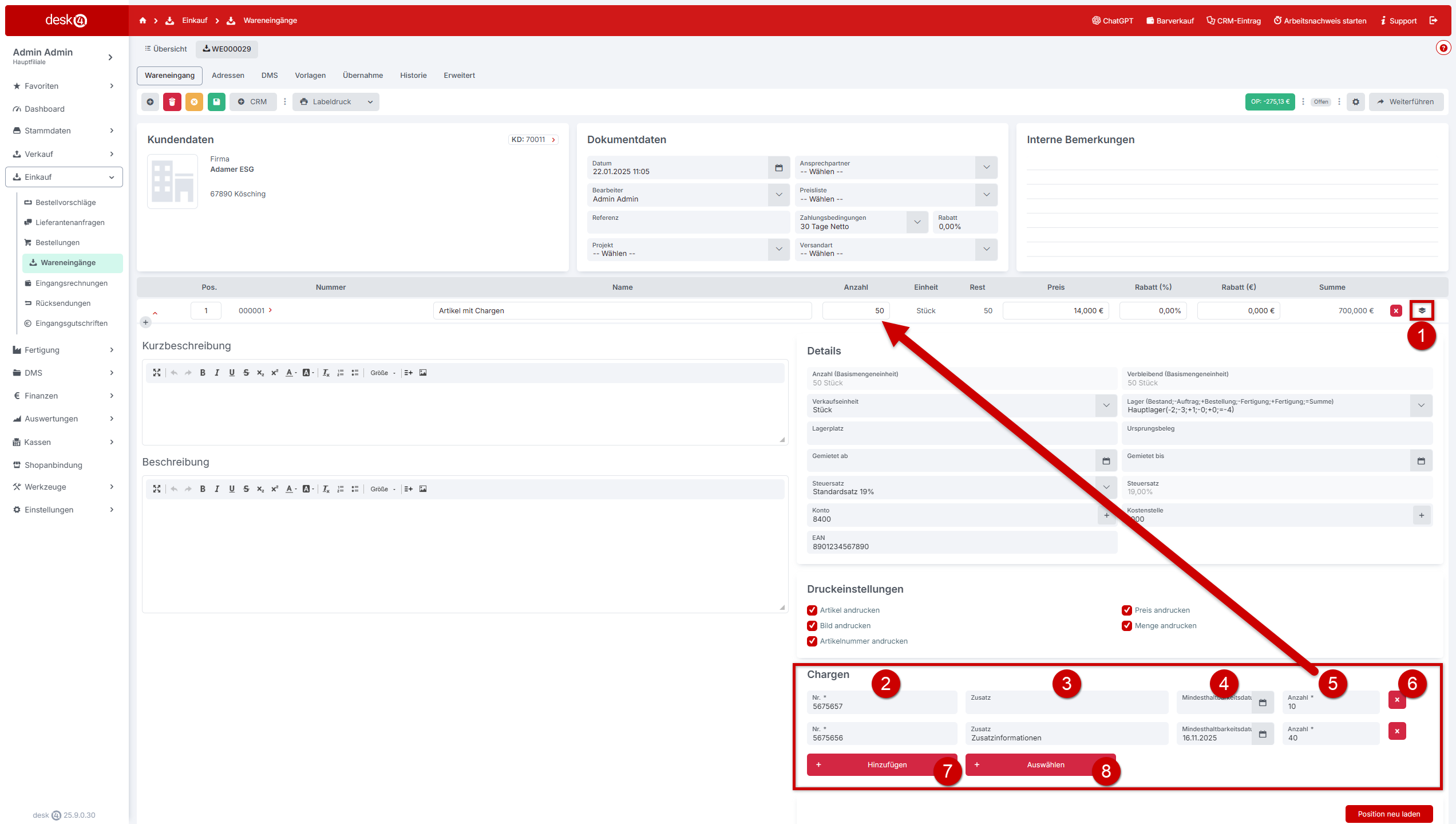 7. Sie können weitere Chargen für die Position hinzufügen.