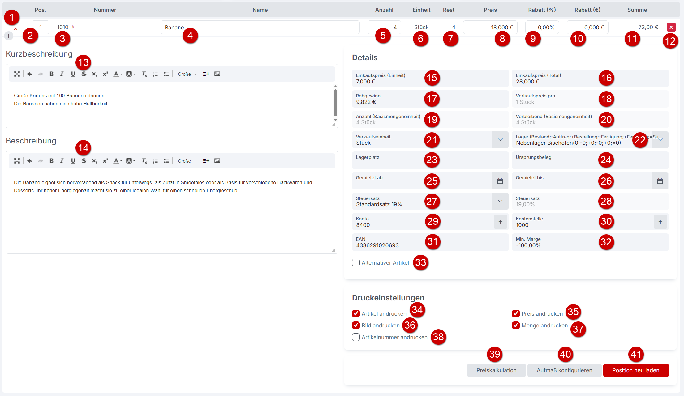2. Position (Reihenfolge) des Artikels im Beleg. Sie können die Reihenfolge ändern, indem Sie eine andere Zahl in das Eingabefeld schreiben. Nachfolgend klicken Sie aus dem Eingabefeld heraus (einfach an eine andere Stelle im Beleg). Nun wird der Artikel an der neuen Position angezeigt.&#x20;