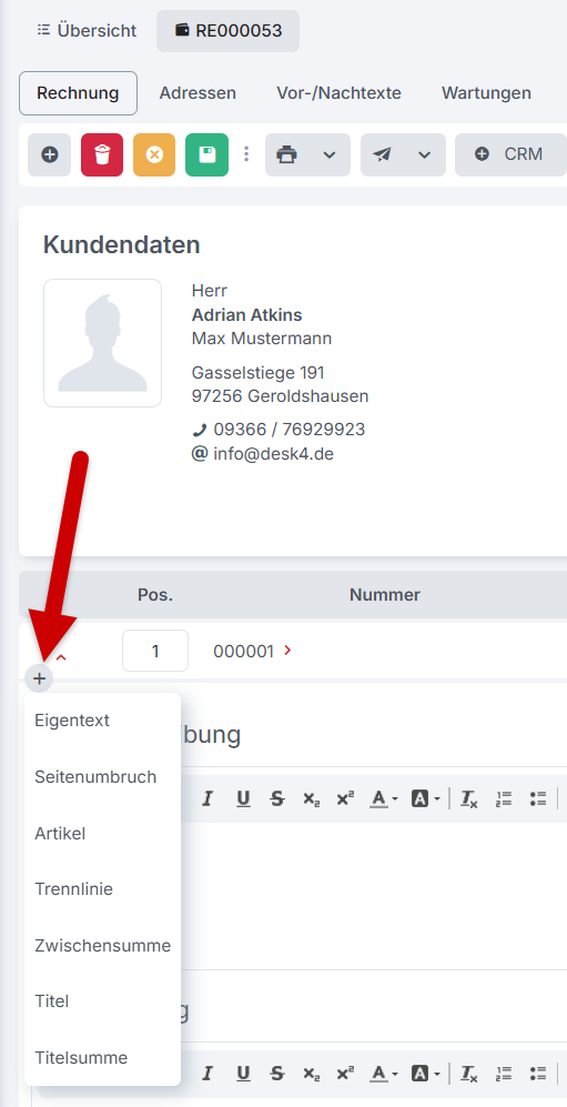 Über das Plus-Symbol auf der linken Seite können Sie an jeder Stelle weitere Positionen hinzufügen.&#x20;